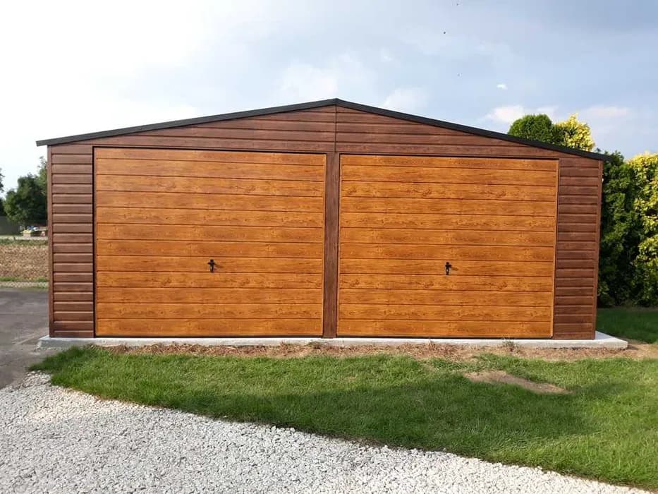 Realizacja Kraków, Błonie. Garaż blaszany dwustanowiskowy kolor złoty dąb, wymiary 4,5 m x 6 m, dach dwuspadkowy, bramy uchylne do góry. Wysokość w szczycie 2,3 m, dostępna wersja z rynnami.